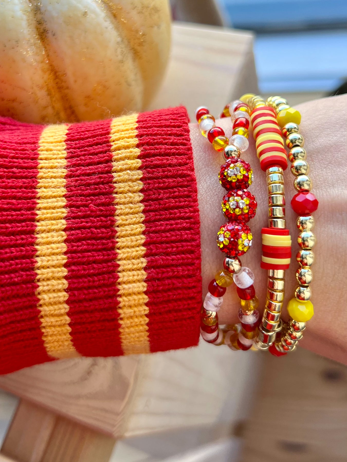 The Party Starter Stack brings instant energy to your wrist with its playful mix of colors, textures, and sparkle. Featuring red, gold, white, and yellow beads plus a leopard shamballa accent, this stack is equal parts statement and versatile styling piece. Whether it’s gameday or just a day you want to shine, this set is ready to celebrate.