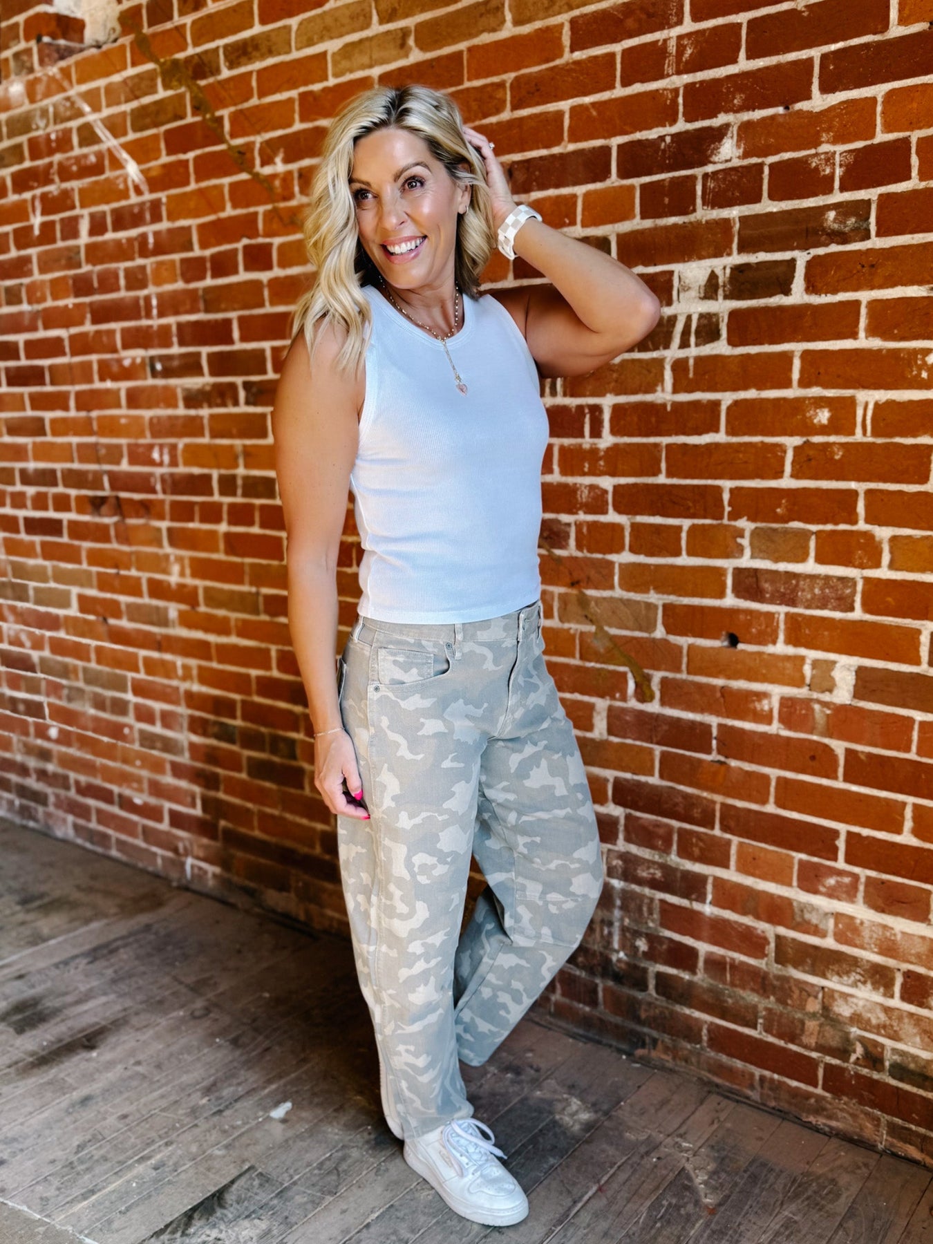 Laid-back with a cool-girl twist. The Soft Recon Camo Barrel Jean delivers that effortless, off-duty vibe with a modern barrel-leg silhouette and a flattering high rise. The neutral camo keeps it wearable while the cropped length makes it perfect for sneakers, sandals, or slides. Easy, edgy, and surprisingly versatile.