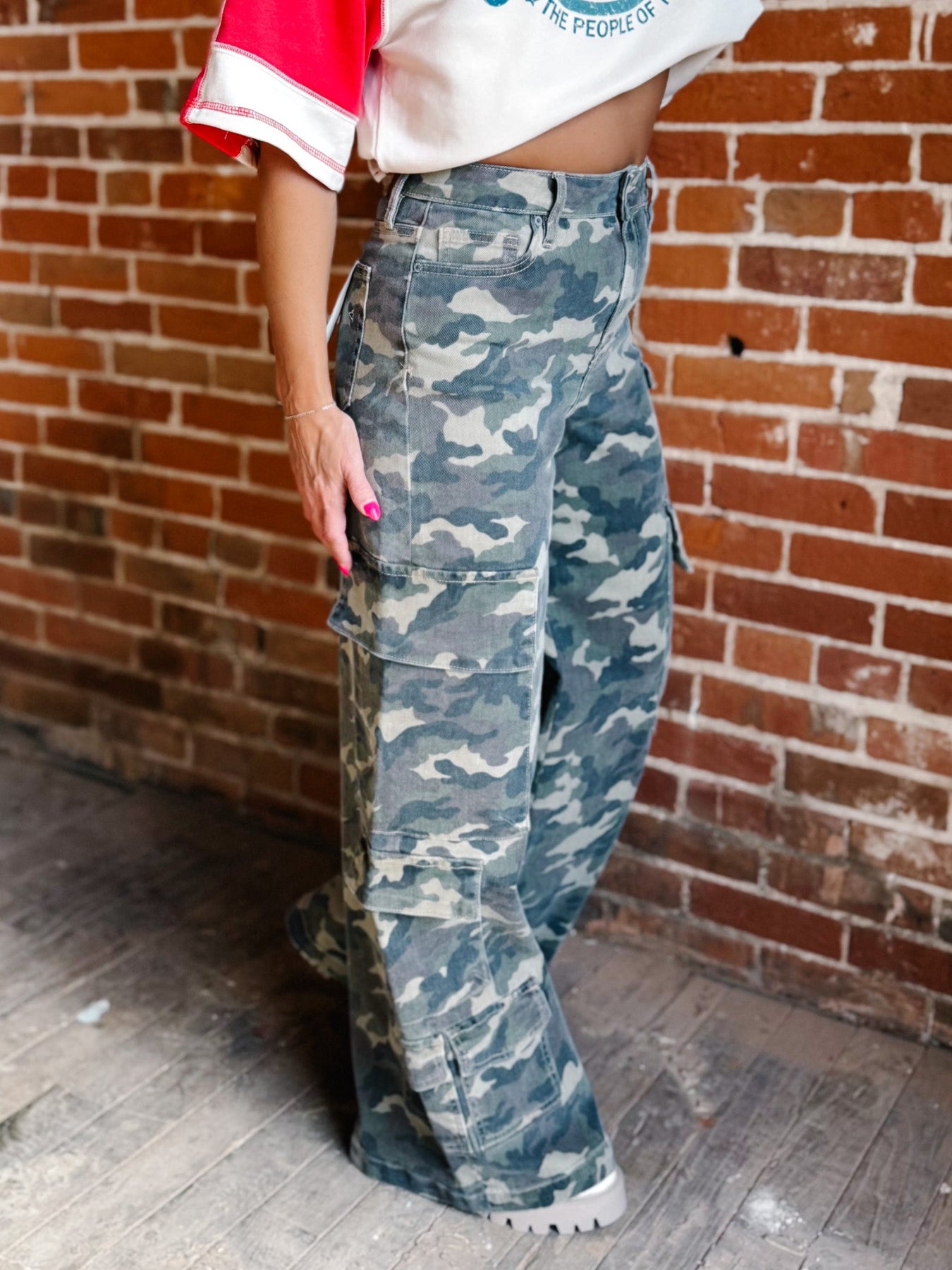 A little edge, a lot of confidence. The Wild Utility Camo Cargo Denim brings that cool, effortless attitude with a flattering fit and just enough stretch to keep things comfortable. Designed with a high-rise waist, wide-leg silhouette, and statement cargo pockets, this pair is made for days when you want your outfit to do the talking.