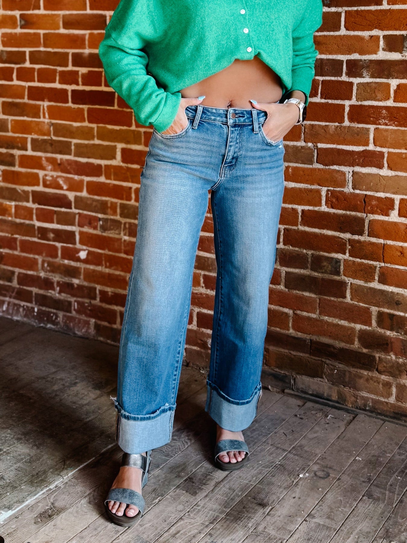 Cuffed Confidene High Rise Wide Leg Cuff Jeans, Medium Wash