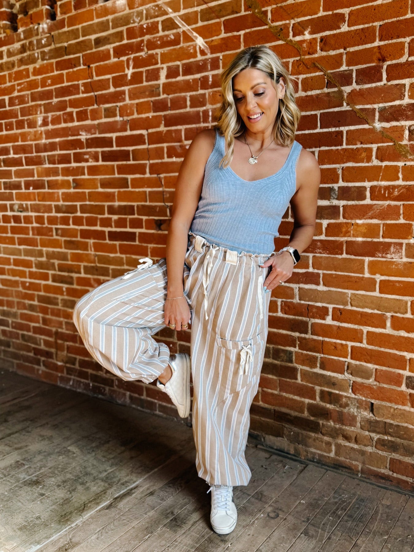 Effortless, everyday joggers designed for comfort and movement. The Easy Motion Joggers feature a soft washed fabric, relaxed billowy fit, and vertical stripe pattern that flatters while keeping things casual-cool. Finished with an elastic waistband, cargo pockets, and cuffed hems, these pull-on joggers are perfect for daily wear, travel days, or off-duty styling.