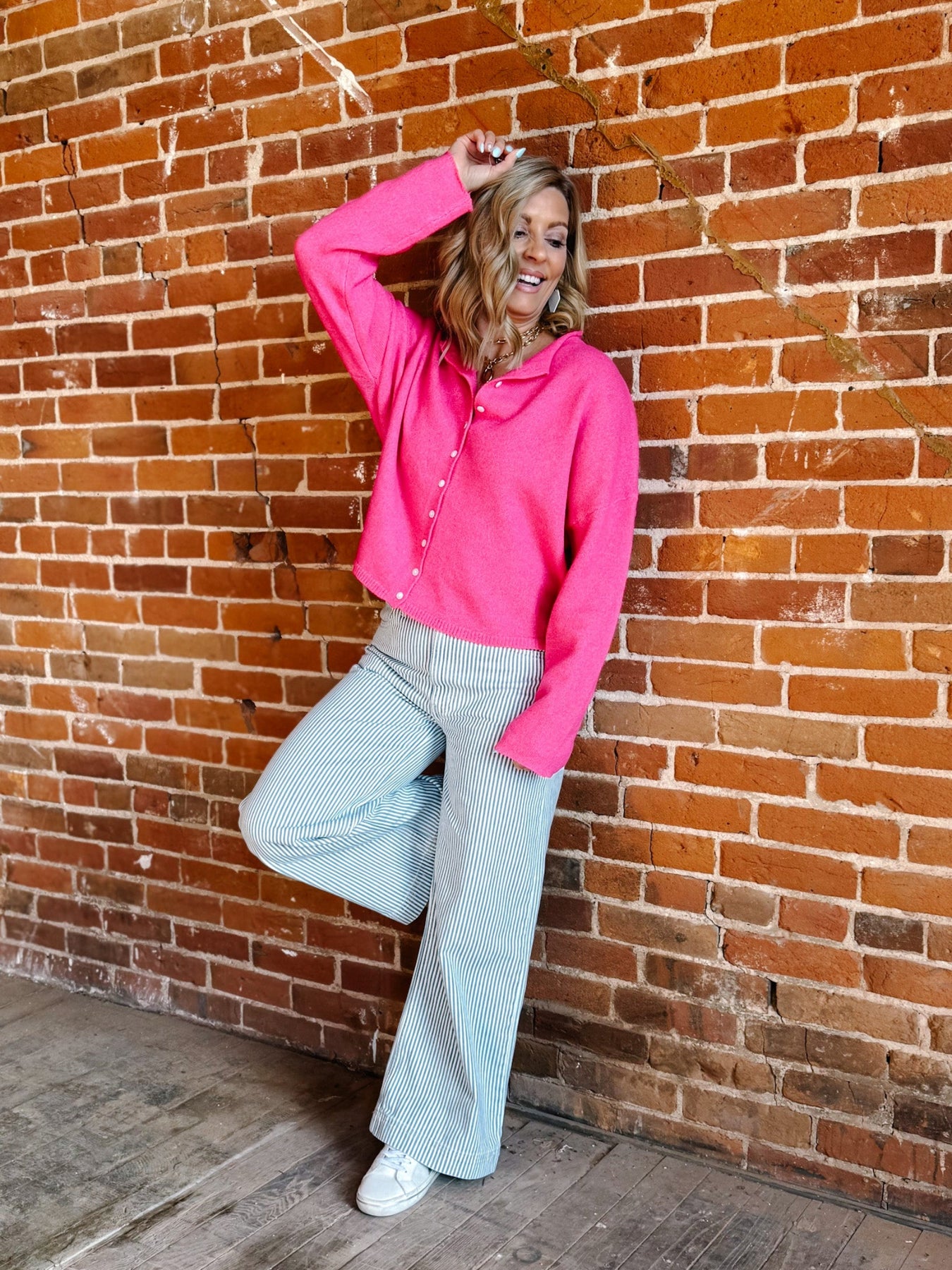 The cardigan that makes cozy look intentional. The Polished Ease Button-Front Knit Cardigan blends laid-back comfort with a refined finish thanks to its soft knit texture, relaxed drop-shoulder fit, and subtle collar-like neckline. Easy to wear buttoned up or open, this is the layer you’ll reach for when you want warmth without bulk and polish without effort.