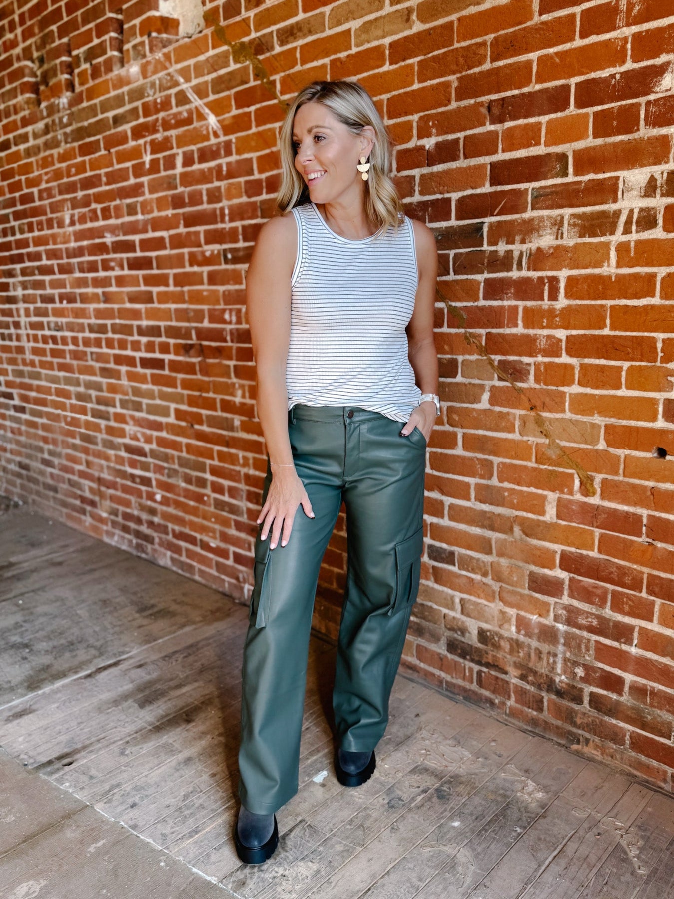 The Straight Chillin’ Leather Cargo Pants deliver effortless edge with a sleek wide-leg silhouette and a modern utilitarian vibe. Designed in a smooth leather-like finish with practical pockets and clean lines, these cargos redefine off-duty chic with a little attitude.