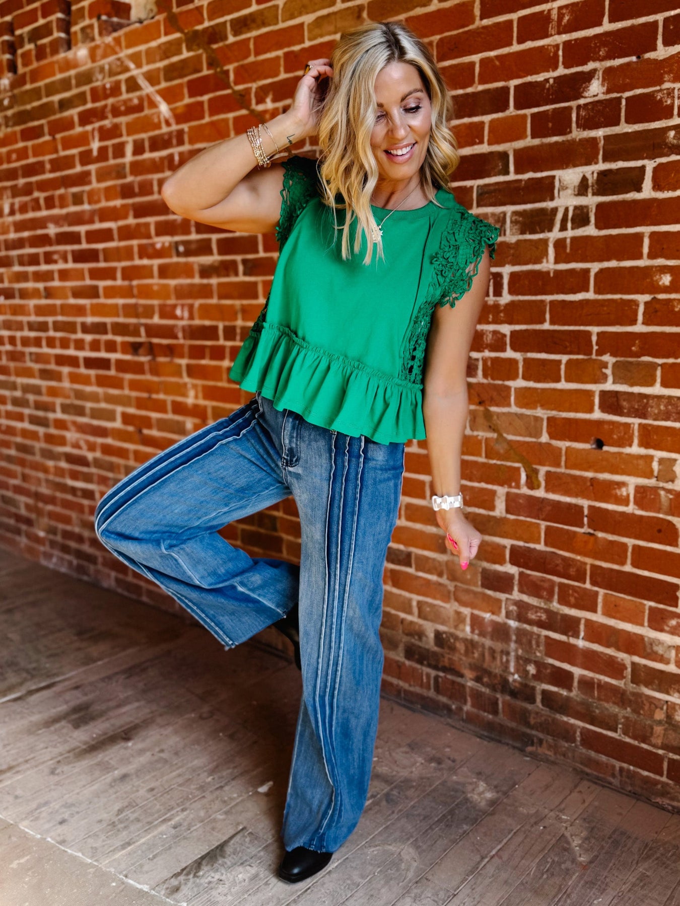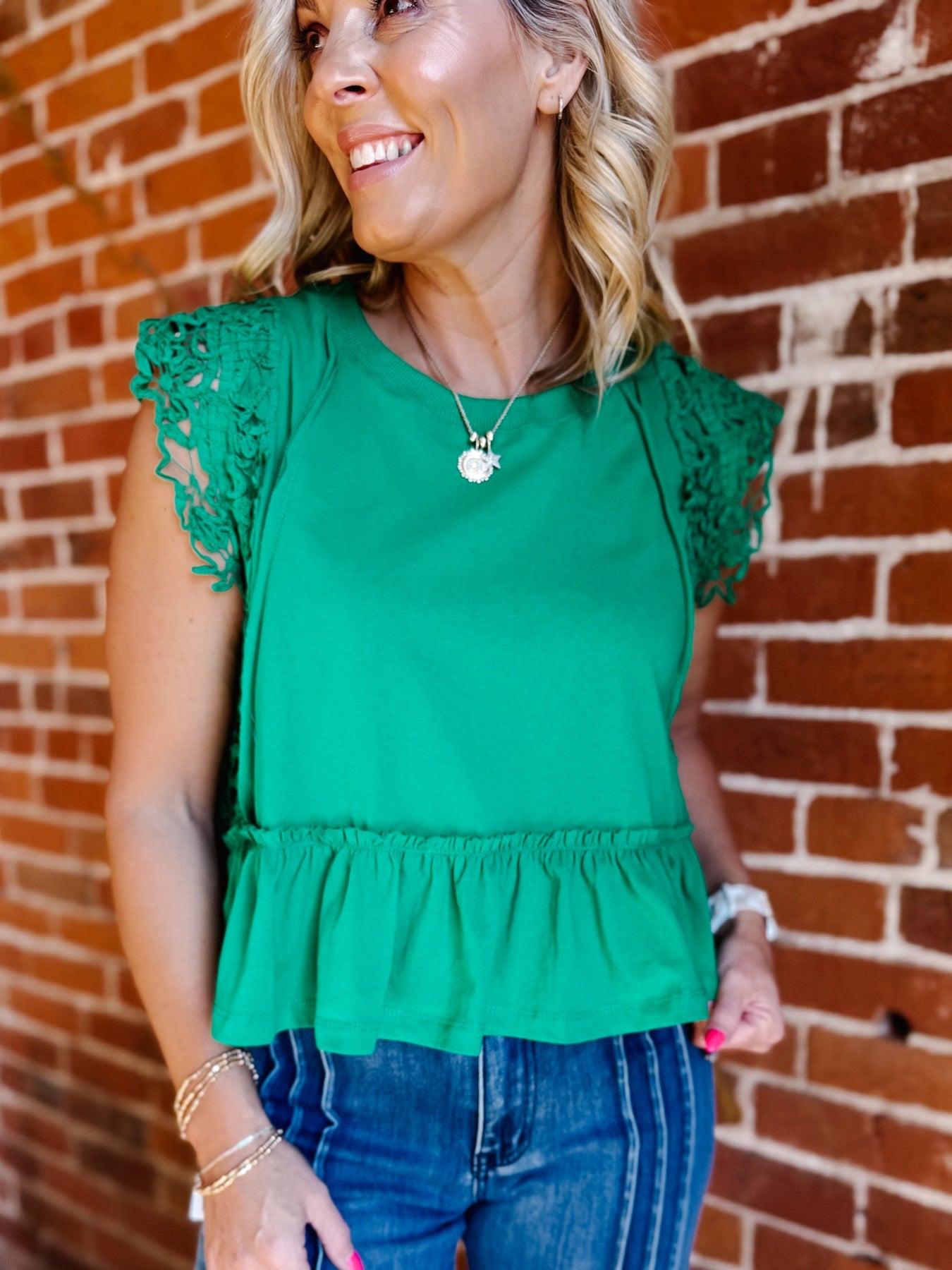 This top is where soft meets statement. Designed with a ribbed round neckline, delicate side lace trim, and an easy ruffle hem, it brings just enough romance without tipping into fussy. The slight cropped length keeps it modern and flattering, while the breathable cotton fabric makes it a warm-weather favorite you’ll reach for again and again.