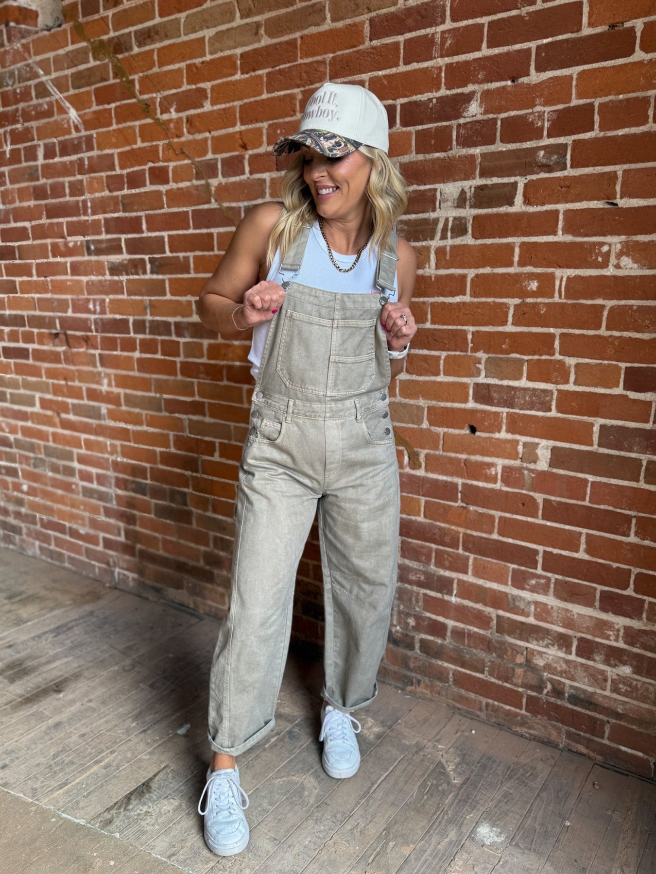 Workday Cool Barrel Overalls – Stone – Laid-back utility with a modern, cool-girl twist.