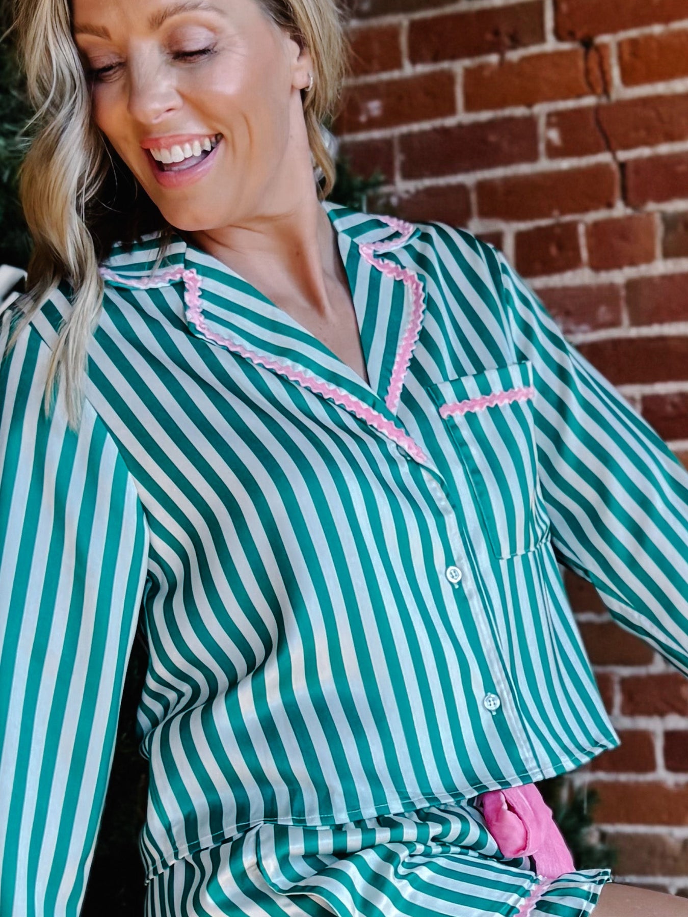 The Merry & Bright Striped Satin Pajama Set brings timeless holiday cheer to your cozy lineup. Designed in festive green and white stripes with pink wavy velvet trim, this silky set features a long-sleeve collared top with a chest pocket and “Merry & Bright” embroidered across the back. The matching shorts include a ruffled hem and a velvet drawstring tie—perfect for lounging, gifting, or Christmas morning magic.