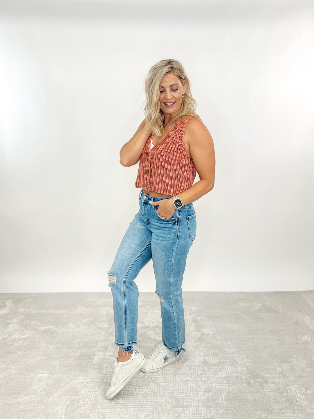 The Blaire jeans are your effortless everyday upgrade. With just the right amount of distressing and a frayed hem, this straight crop silhouette gives you the freedom to dress it up or down. A high-rise fit flatters your shape while super stretchy denim moves with you—perfect for chasing kids, weekend errands, or hitting the town with your crew.