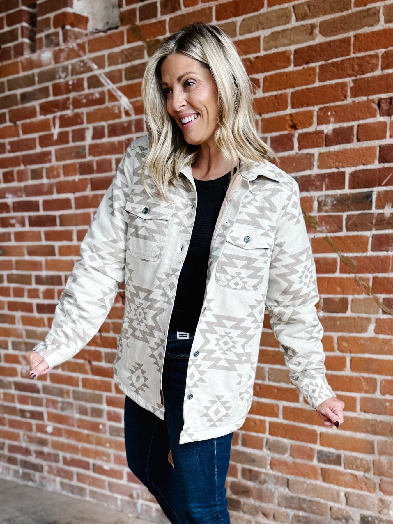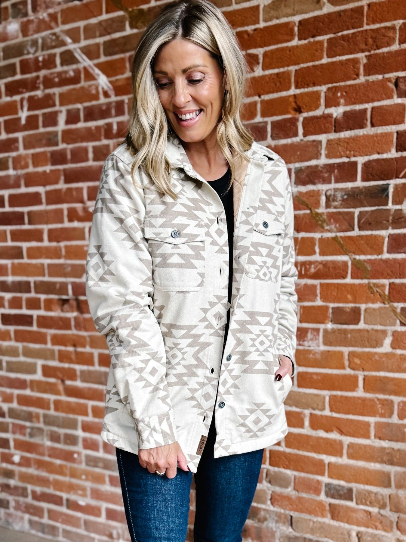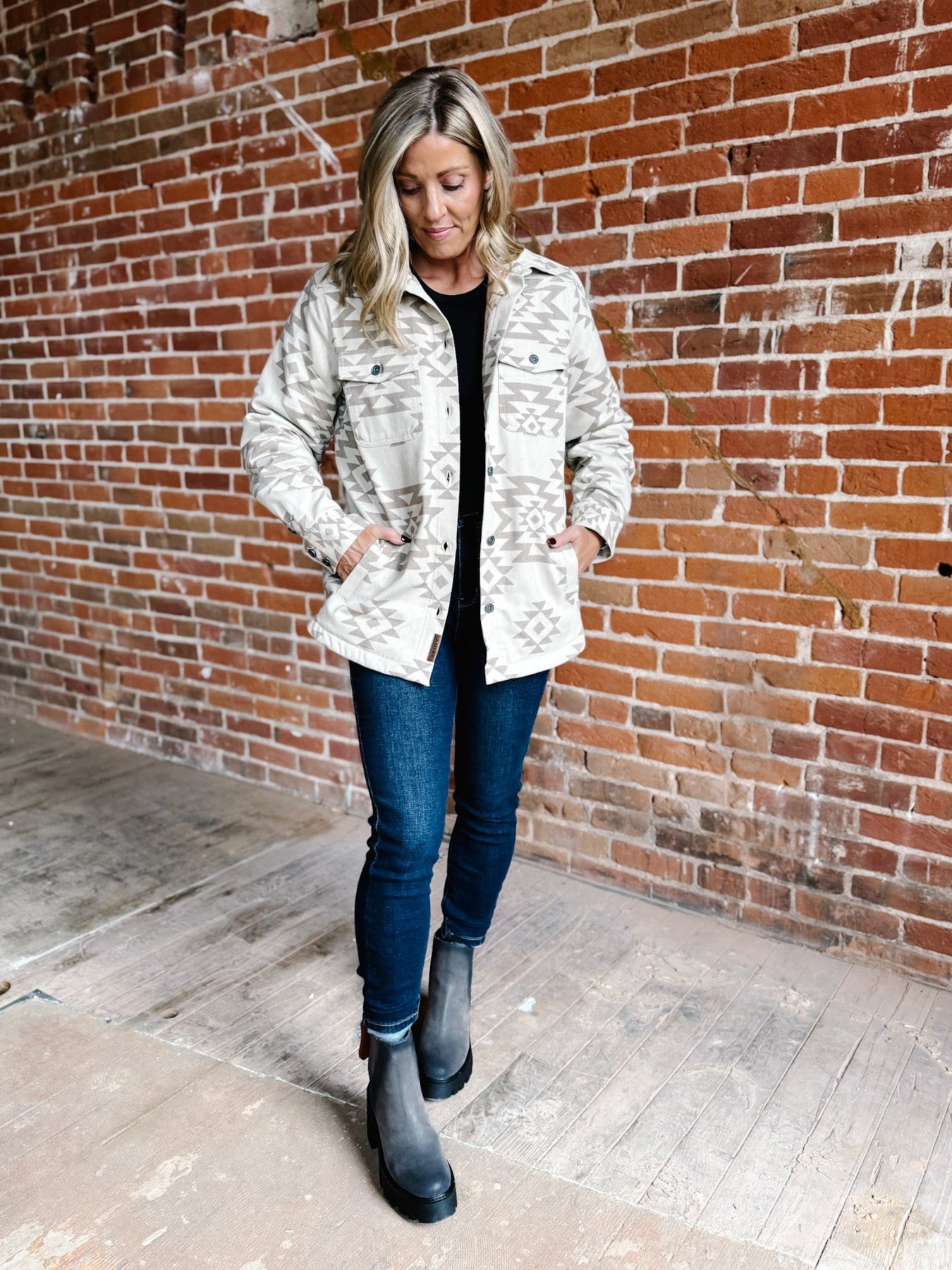 Inspired by the warmth of tradition and crafted for everyday ease, the Clovis Shacket brings a heritage vibe to your fall layering game. Featuring a relaxed fit for easy movement, this neutral-toned piece showcases a subtle geometric pattern, dual chest and hand pockets, and lightweight insulation for chilly mornings and crisp evenings. Toss it over your favorite denim or joggers for that lived-in, layered-up look.
