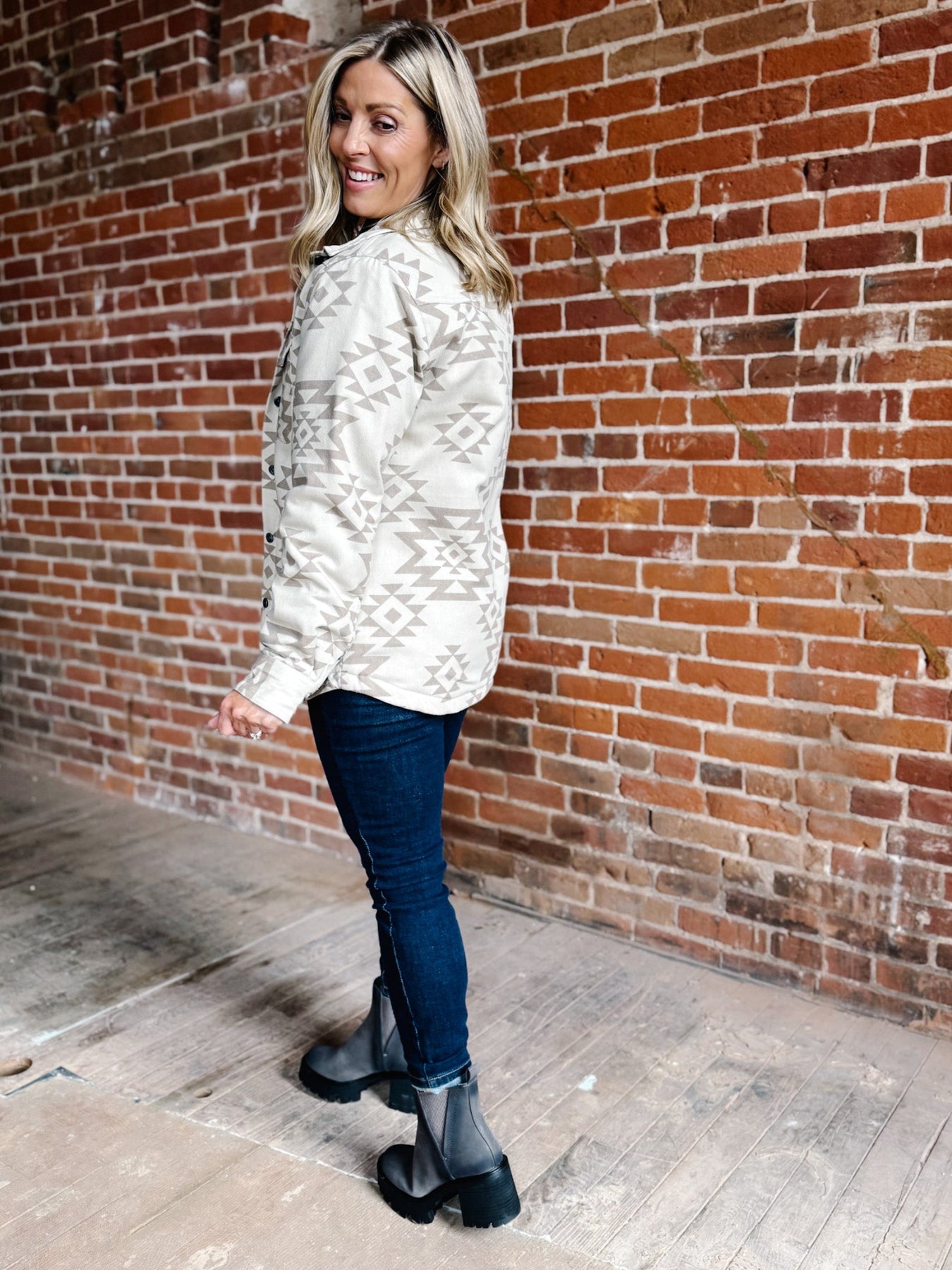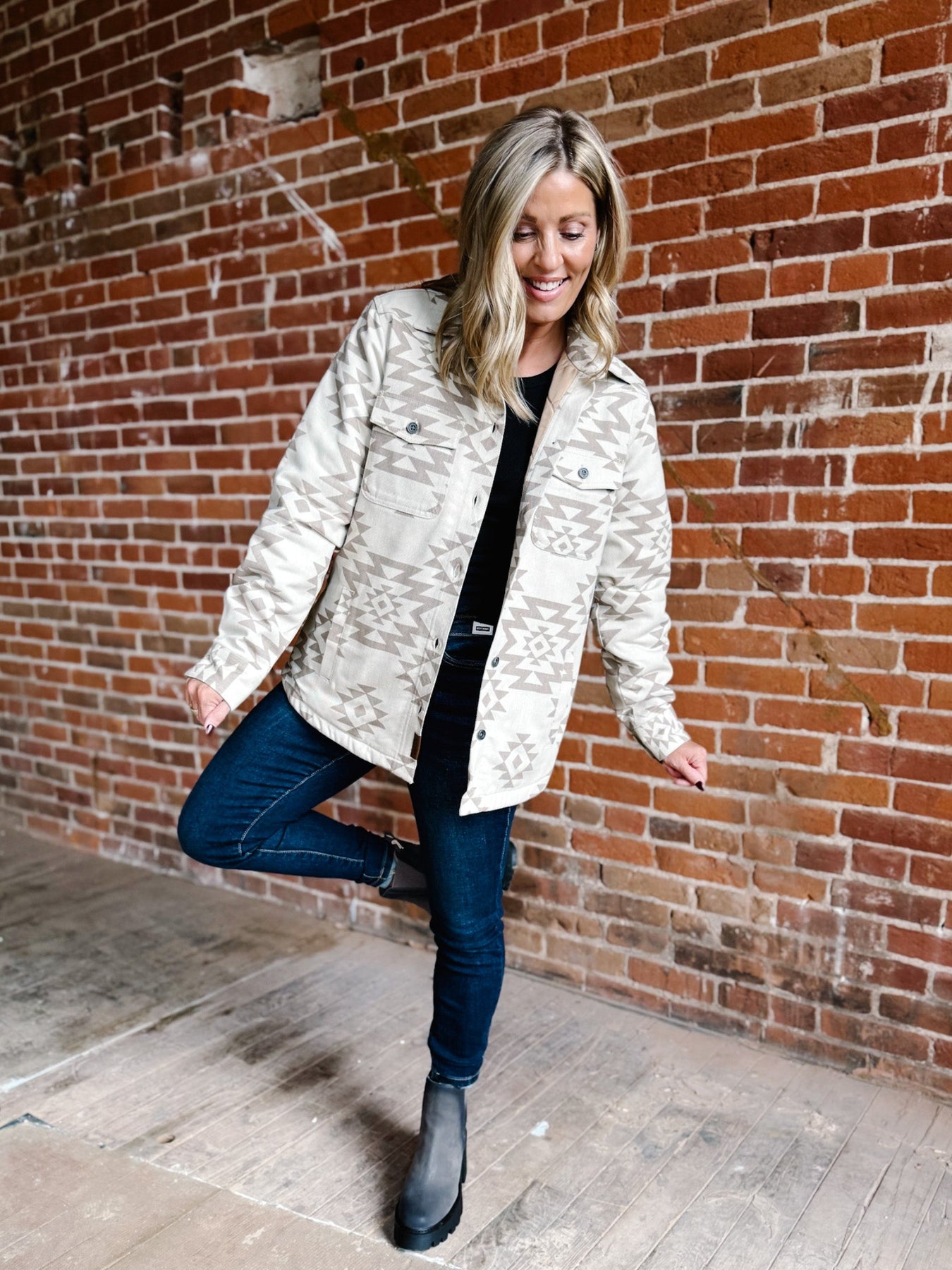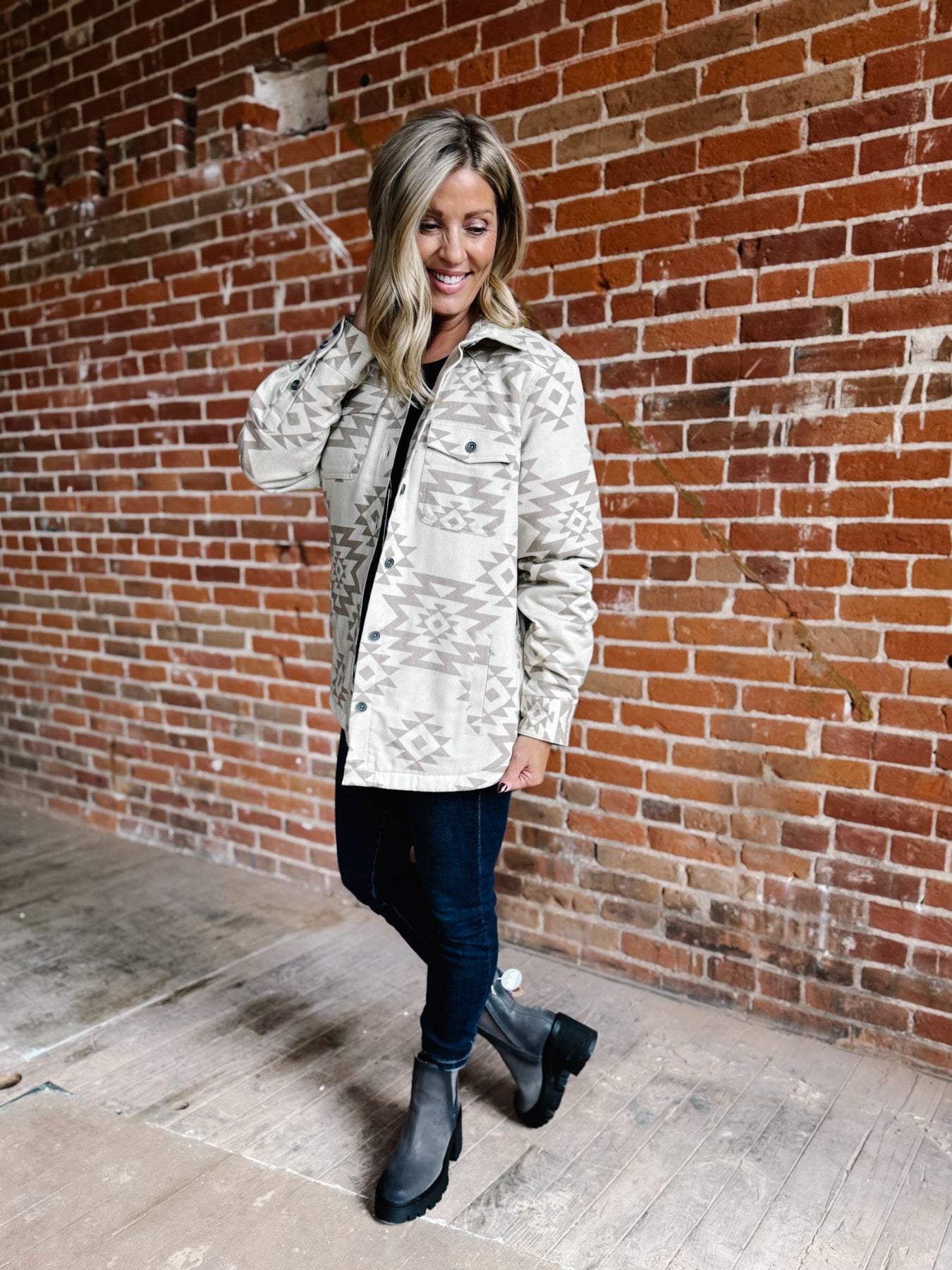 Inspired by the warmth of tradition and crafted for everyday ease, the Clovis Shacket brings a heritage vibe to your fall layering game. Featuring a relaxed fit for easy movement, this neutral-toned piece showcases a subtle geometric pattern, dual chest and hand pockets, and lightweight insulation for chilly mornings and crisp evenings. Toss it over your favorite denim or joggers for that lived-in, layered-up look.