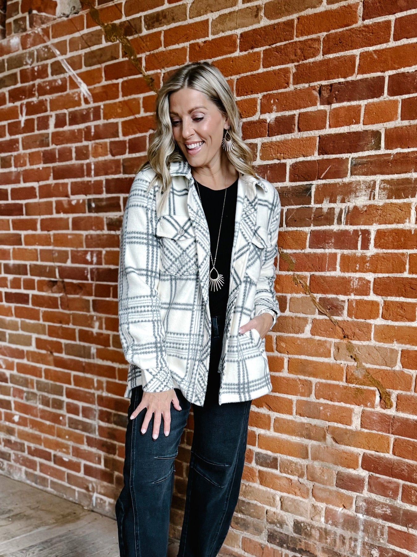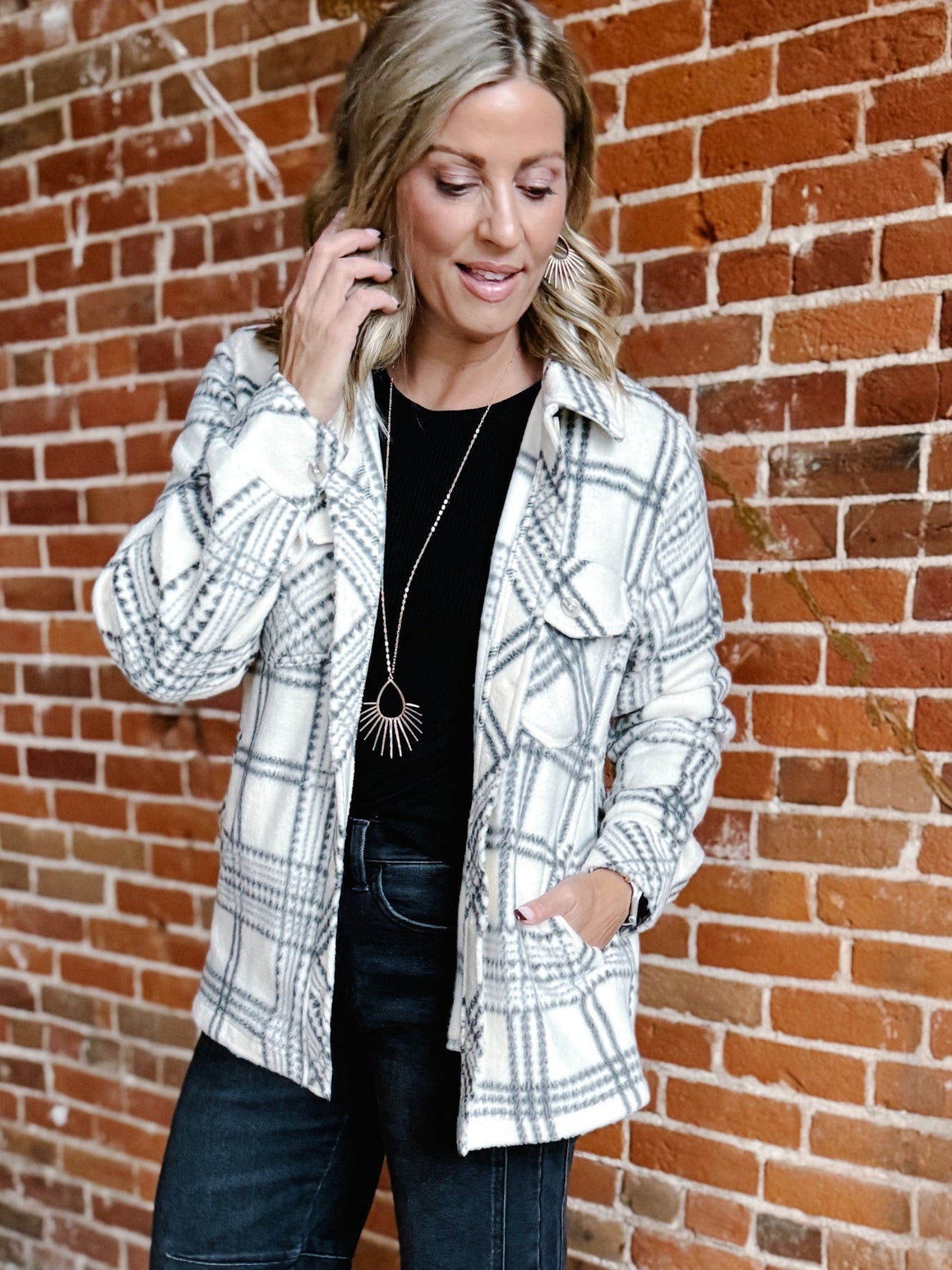 The Santa Fe Plaid Fleece Shacket in tofu ash brings cozy texture with a modern neutral twist. Designed with a collared neckline, button-front closure, and dual chest pockets, this relaxed-fit piece layers effortlessly over tees, knits, and everything in between. Its soft fleece fabric keeps you warm, while the ash plaid print keeps your style on point.