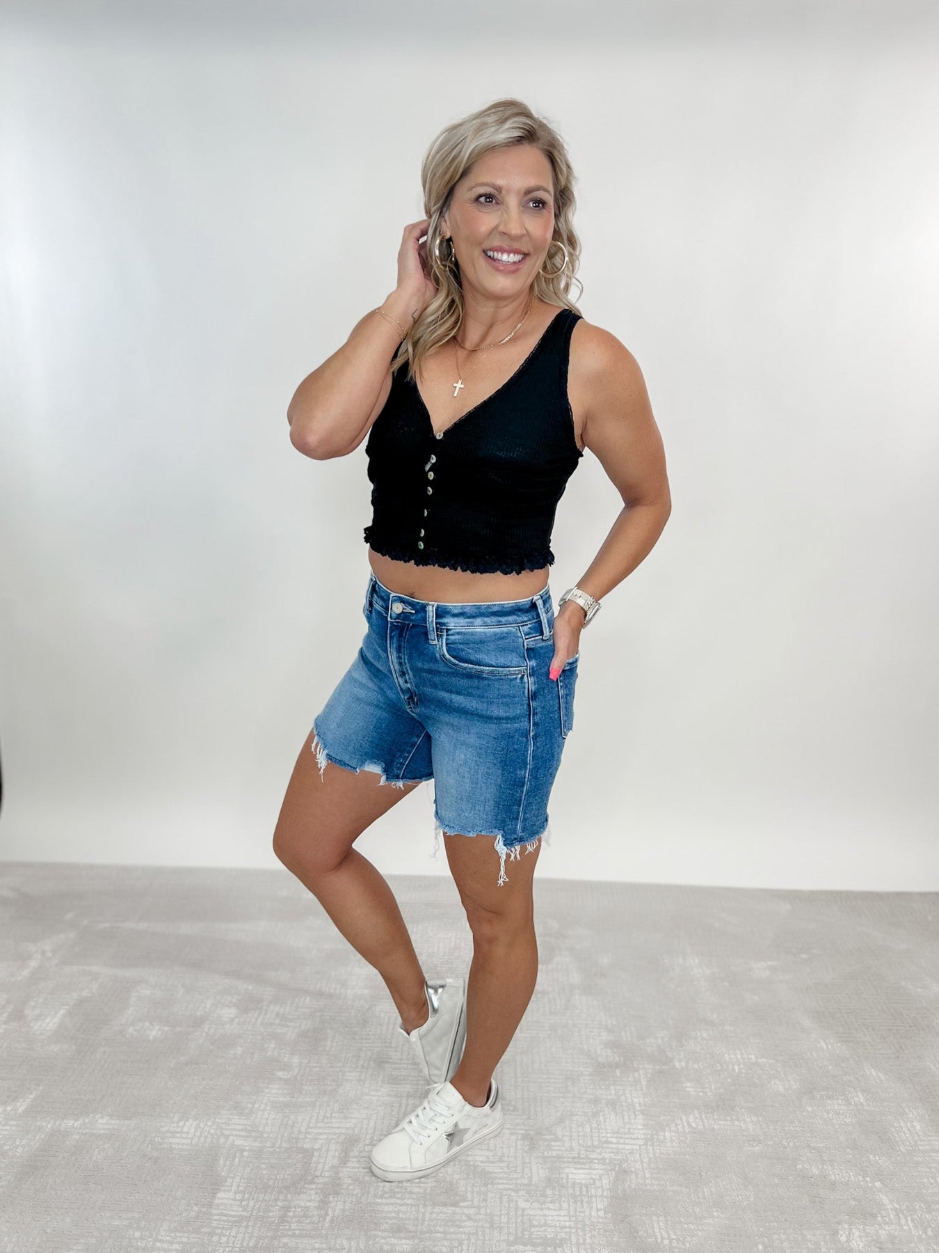 The Off Duty Denim Shorts bring relaxed comfort with a clean, non-distressed finish and just the right amount of edge. Crafted from comfort stretch denim, they feature a high-rise boyfriend fit and a raw hem that adds a laid-back touch. Whether you're running errands or soaking up the sun, these shorts deliver easy style with zero effort required.