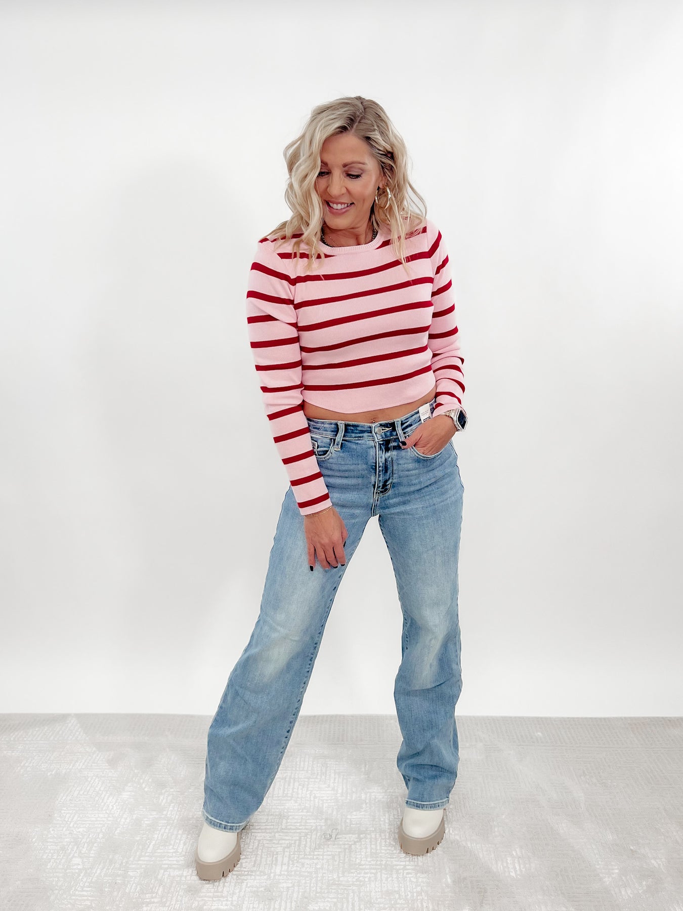 Indulge in bold and vibrant fashion with our Peppermint Stripes Cropped Long Sleeve Top! This stylish top boasts a flattering cropped length and a chic crew neckline. The eye-catching pink and red stripes add a touch of playful charm to any outfit. Elevate your wardrobe with this must-have piece!