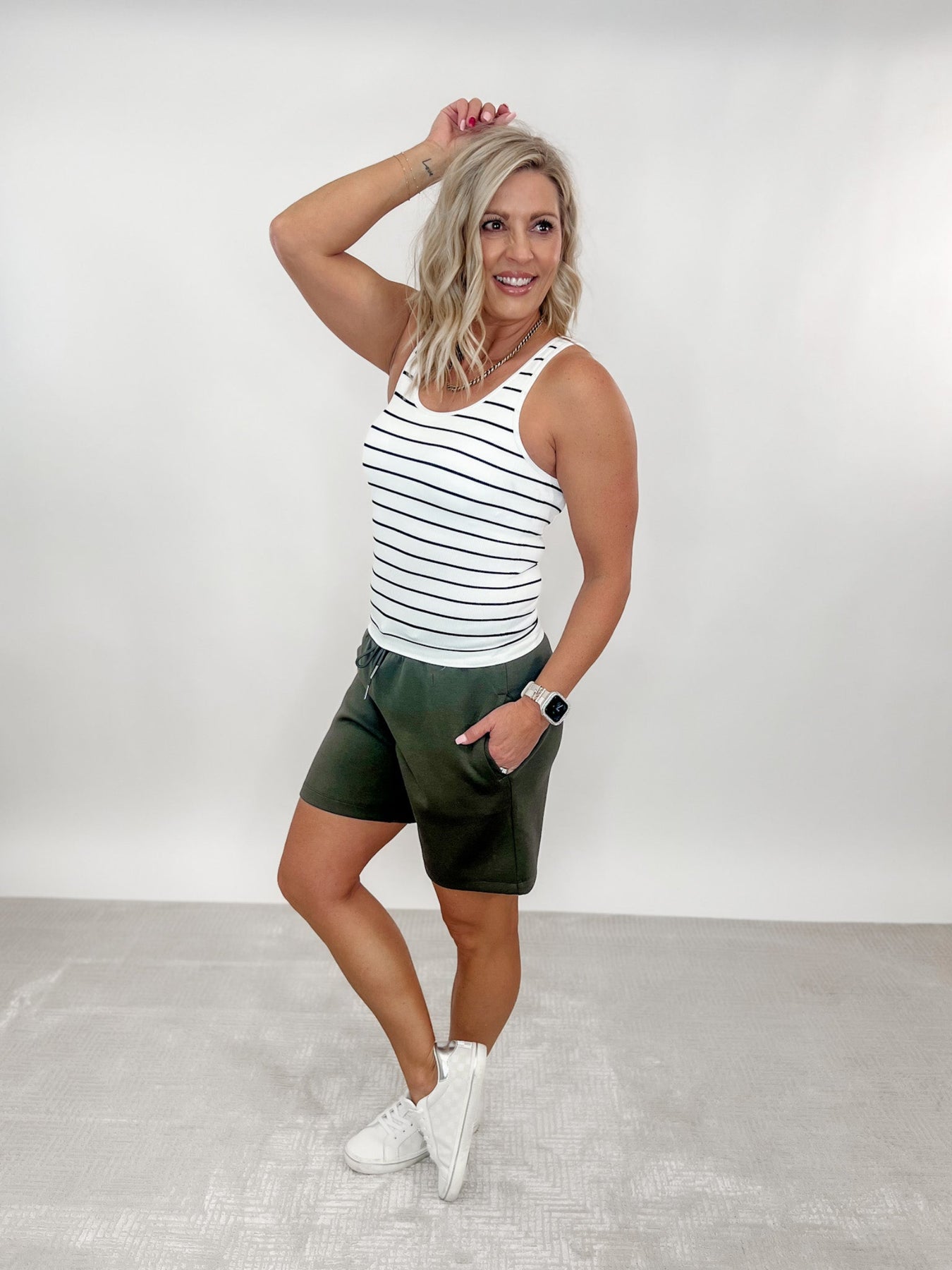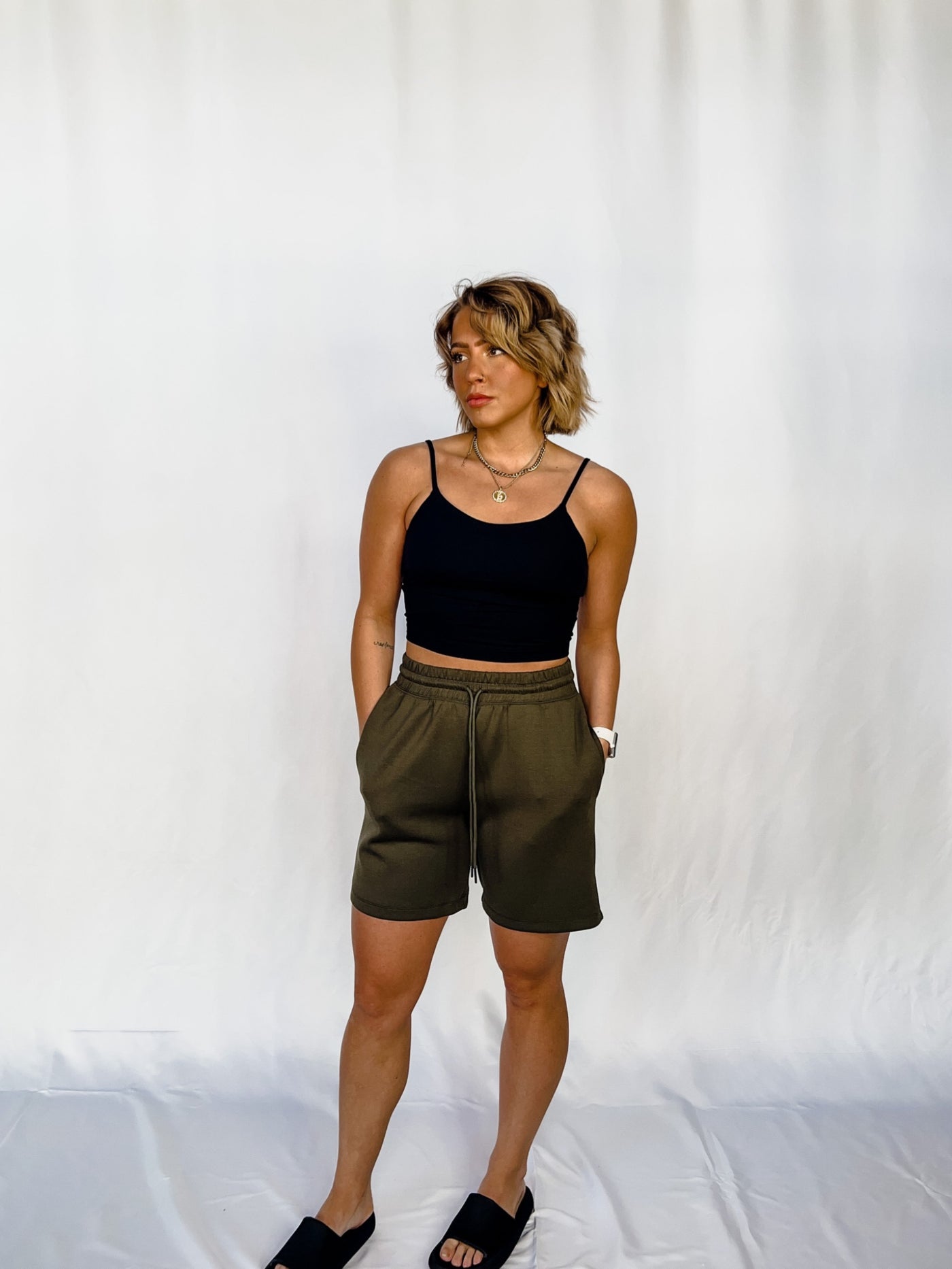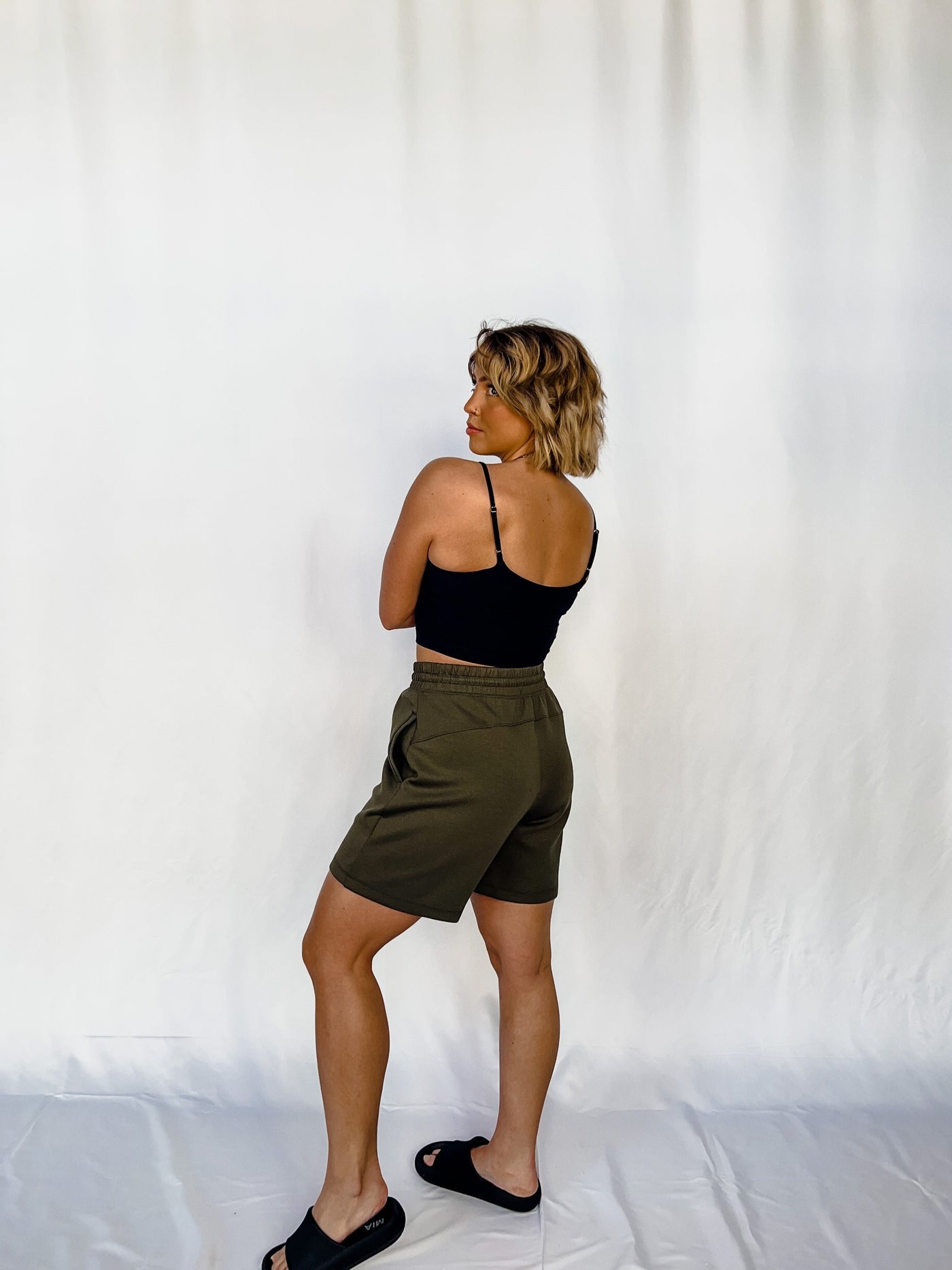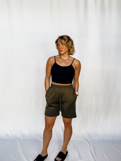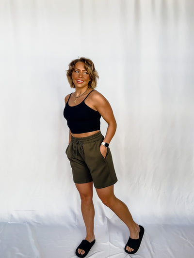 Laid-back meets elevated in these olive green Ponti shorts with an ultra-comfy, tailored vibe.