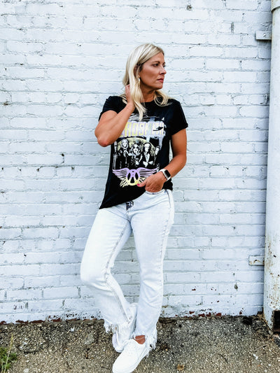 Take your style for a spin in this Aerosmith Band Logo Tee. Featuring a worn in look and classic black styling, this tee is perfect for the risk-taker with a passion for music. Show off your adventurous style while rocking out to your favorite Aerosmith tunes!