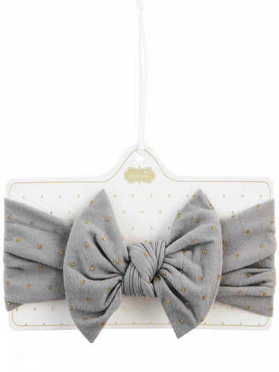 Top off every outfit with our Gray Polka Dot Toddler Headband. The nylon bow headband features gold lurex polka dots. The headband features a gray background with small gold dots all over. The headband features a bow in the center. This headband fits best on children ages 3 and older.