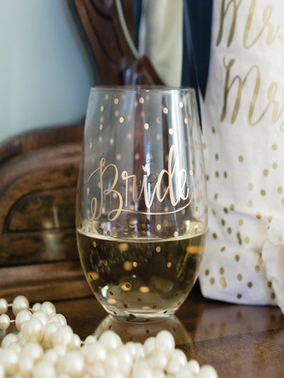 Toast to your special day with this adorable Bride Polka Dot Stemless Wine Glass! With its playful polka dot design and stemless design, this glass is perfect for sipping on your favorite wine while getting ready for the big day. Cheers to the bride!