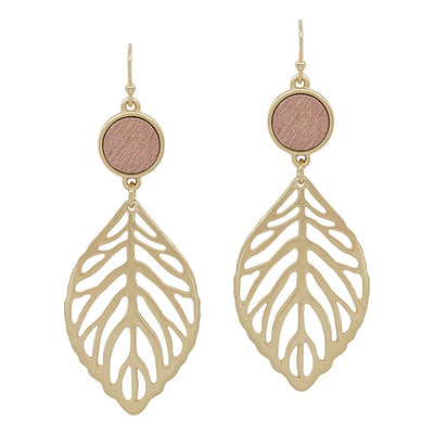 Brown Wood Circle with Leaf Drop Earrings, Matte Gold