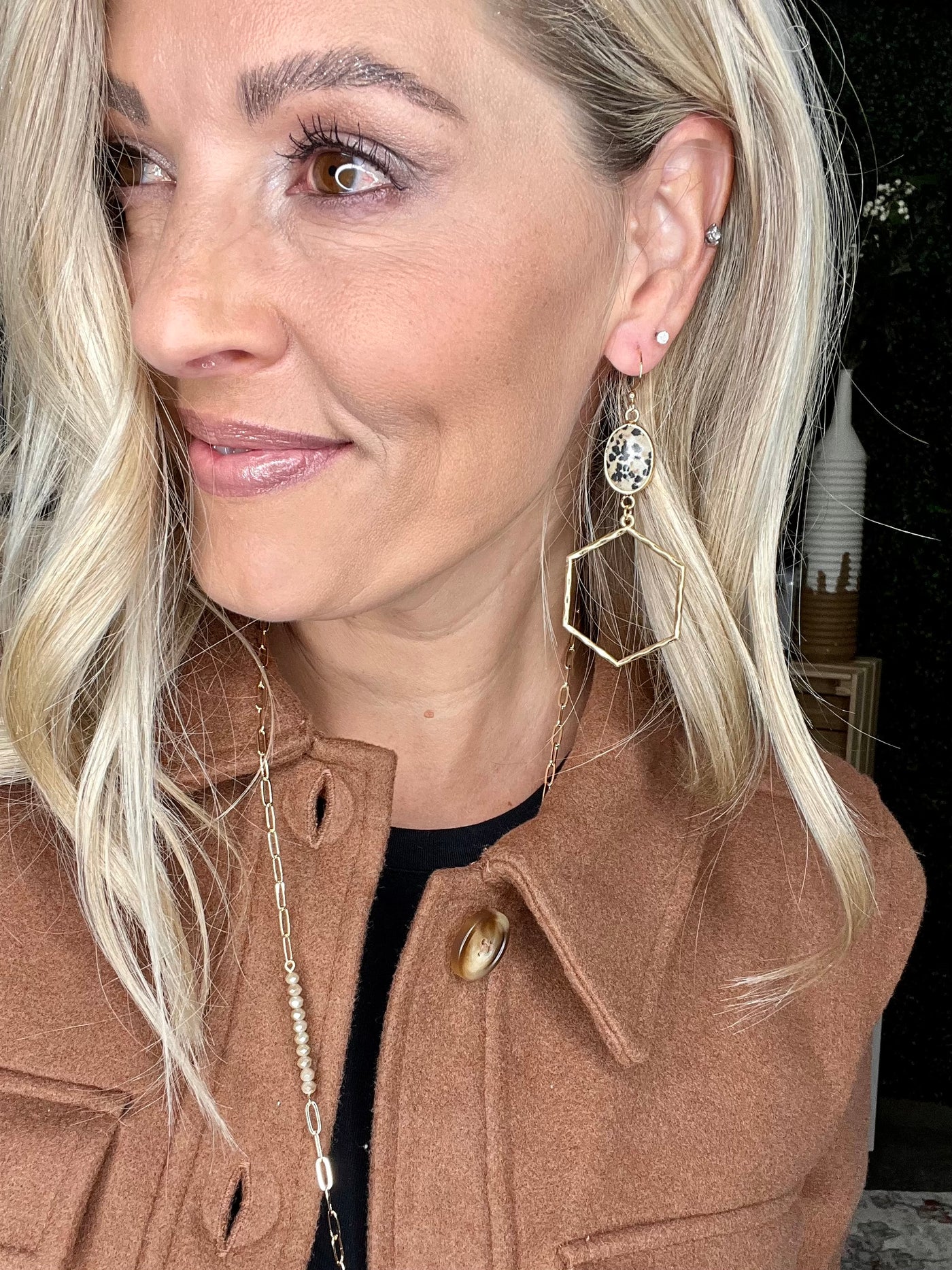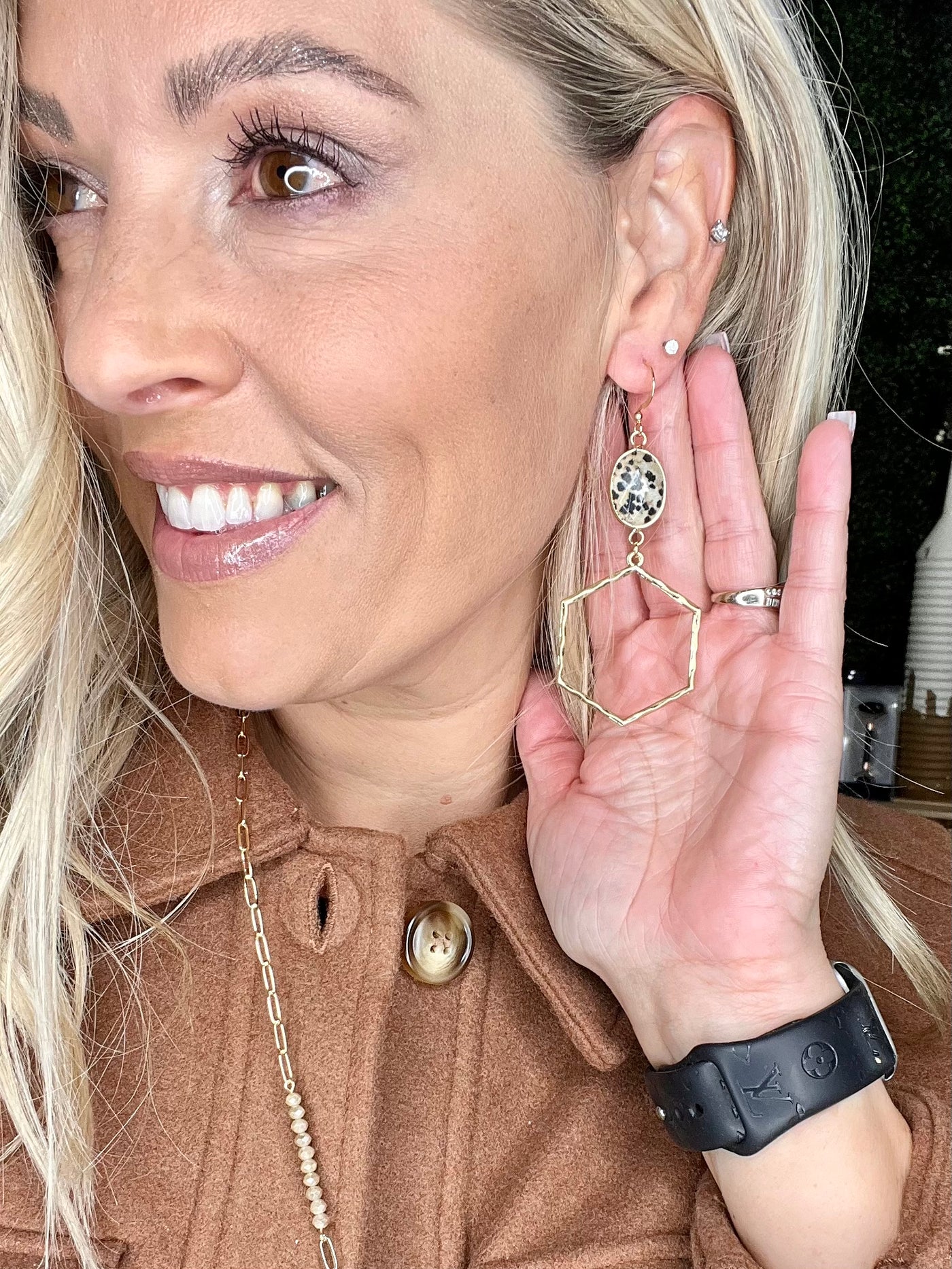 Elevate your outfit with these statement earrings for a limitless looks! Featuring a dalmatian natural stone and a gold hexagon drop pendant to elevate the look of your outfit. From jeans to little black dress this will add that next level to your outfit.