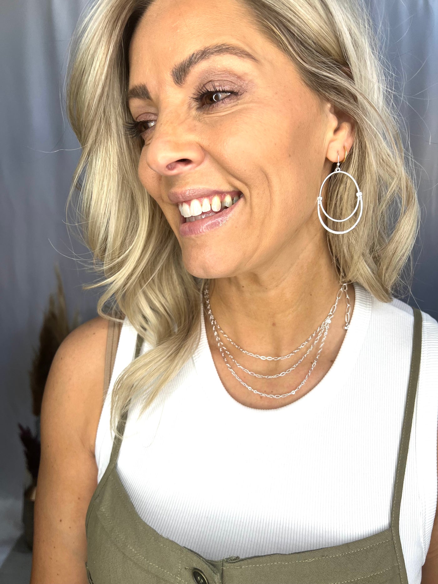 Such an ideal silver necklace to layer and style with limitless looks! Featuring a triple layered dainty chains to add that perfect touch.