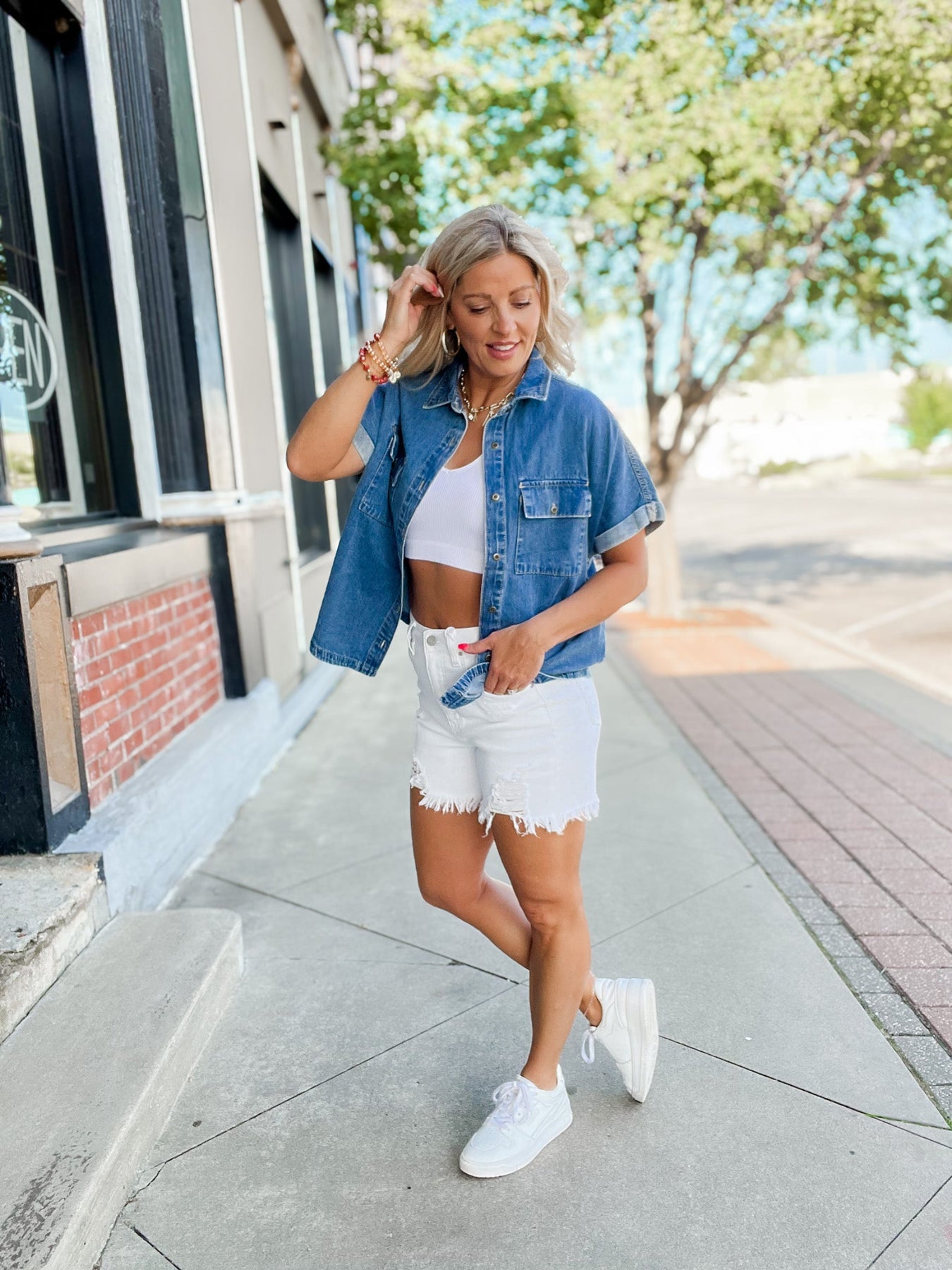 Meet the ultimate not-so-basic basic. The True Blue Button-Up brings everyday charm with a soft-washed denim feel and versatile structure that fits your mood and your schedule. With cuffed short sleeves, utility-style front pockets, and a relaxed silhouette, this is the shirt you’ll grab again (and again) when you want that effortlessly styled look. Pair it with cutoffs, layer it with a cardigan, or wear it open over a tank—no wrong moves here.