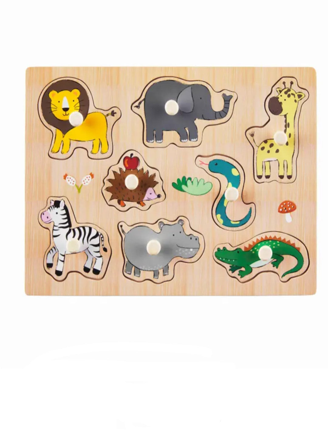 Puzzles and Books are two of my favorite gifts to give. Our Safari knob puzzles are sure to be a hit. The wood puzzle features knob handles. The puzzle features shapes of lions, zebras, elephants, giraffes, hippos, snakes and more. The puzzle is great for toddlers and we recommend the puzzle for children ages 18 months or older.